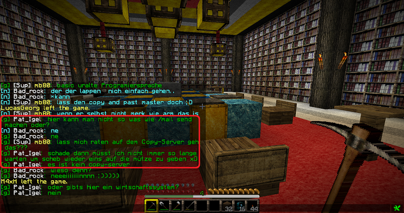 Moralisch finde ich das ganze erbärmlich. Natürlich soll man sich inspirieren lassen, aber dann letztlich doch etwas eigenes (er)schaffen. Dass sie es könnten zeigen sie beim Absatz über Chestshop. Ärgerlich macht mich, dass sie nicht nur kopiert, sondern offenbar das völlig veraltete Tutorial nicht einmal ganz GELESEN haben. Bei kopierten Bauwerken tut es mir für die Erschaffer auf Geistlande leid. Es war schon öfter in der Überlegung, die Map von Geistlande einmal zum Download zu stellen, damit Erbauer sozusagen eine Version ihres Schaffens mit sicherem Gefühl zu Hause auf der Festplatte haben. Wir haben letztlich davon Abstand genommen und hier zeigt sich wieder, dass wir dazu fast schon verpflichtet sind, um die Map als ganzes und einzelne Gebäude vor Plagiaten zu schützen. p. s. "ihr habt kein Handelssystem": das ist bei uns nicht Ergebnis eines Versäumnisses, sondern entspricht der Stimmung innerhalb des Serverteams, wo darüber zu 2/3 ablehnend diskutiert wurde. Dennoch lief eine Kombination aus Diamantenwährung + Broker-Handelsfenster über längere Zeit fertig konfiguriert im Server mit und bei geänderter Nachfrage hätte man das binnen fünf Minuten anschalten können. Seit aber Jeb angekündigt hat, selbst an einem System zu arbeiten sind diese Überlegungen sowieso hinfällig. Allen nicht Diamant- sondern Geldbasierten Währungen wünsche ich dann viel Spaß beim Umrechnen hunderter (oder tausender) Userdaten ![]() _________________________ kaahne - Geistlande Administrator Bitte keine Anfragen per PM, nutzt das entsprechende Forum! |